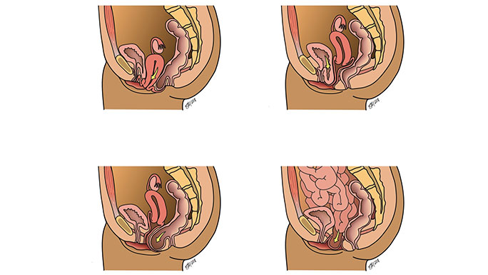 Uterovaginal prolapse (top left), anterior vaginal wall prolapse (top right), posterior vaginal wall prolapse (bottom left), vaginal vault prolapse (bottom right)